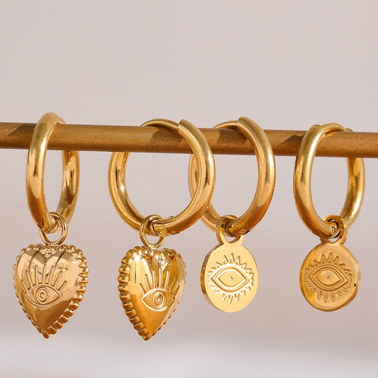 Brincos com olho grego é sempre um dos itens mais buscados e queridinho na lista de muitas clientes. Esse modelo conta com um pendente muito bem elaborado com design exclusivo numa pegada minimalista. O olho grego afasta energias negativas e atrai sorte e boas vibrações. Detalhes: - Brinco banhado...